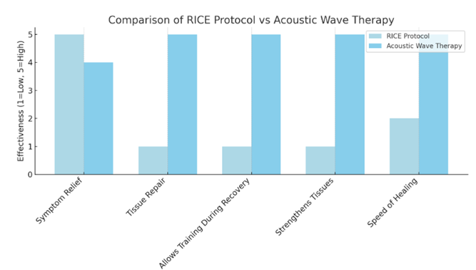 RICE has long been the go-to for managing sports injuries. It helps reduce swelling and pain, but its role is largely passive and symptom focused. In contrast, acoustic wave therapy actively stimulates tissue repair and regeneration. Research shows that AWT treatment provided significant clinical improvement in under two weeks for nearly 70% of patients and reduced pain medication needs by half.